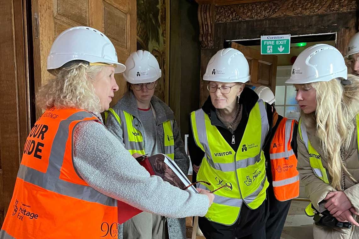A man in an orange hi-vis vest shows visitors the Great Hall ceiling during the restoration work